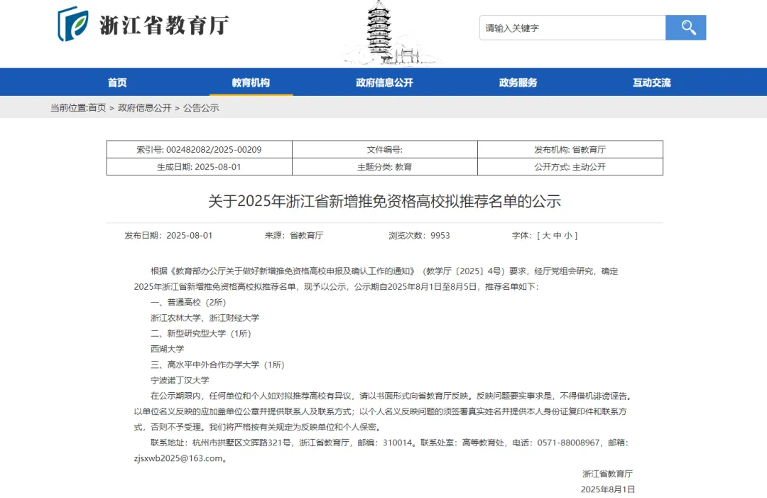 根據(jù)《教育部辦公廳關(guān)于做好新增推免資格高校申報(bào)及確認(rèn)工作的通知》(教學(xué)廳〔2025〕4號)要求,經(jīng)廳黨組會研究,確定2025年浙江省新增推免資格高校擬推薦名單,現(xiàn)予以公示,推薦名單如下: