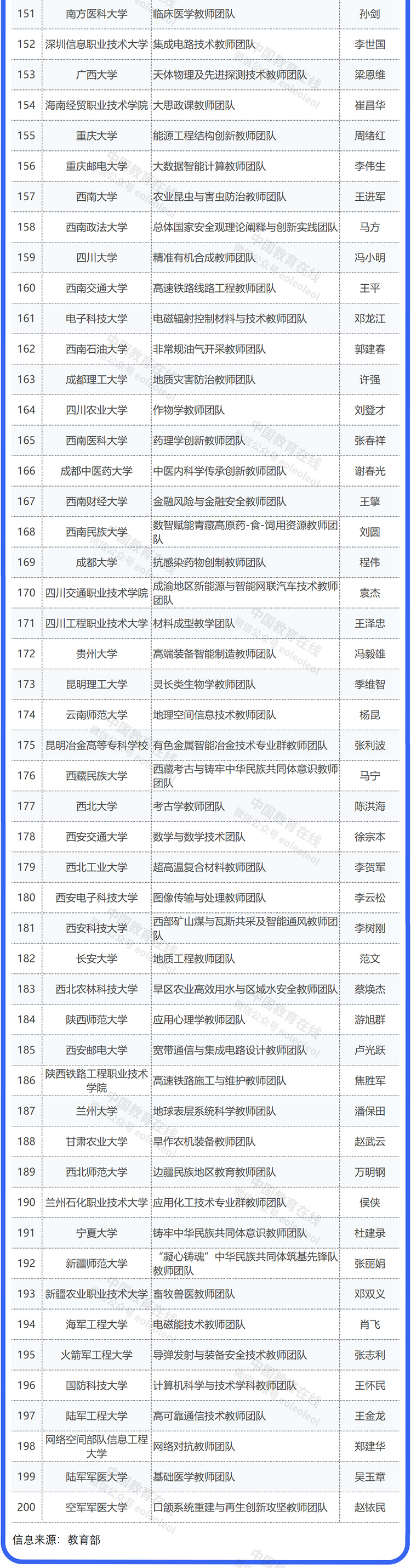 9月5日,教育部公布第四批“全國高校黃大年式教師團隊”創(chuàng)建示范活動入圍名單,共有200所高校入選。名單如下: