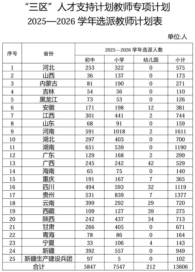 (二)選派數(shù)量。2025—2026學(xué)年全國(guó)計(jì)劃選派13606名教師,其中初中計(jì)劃選派5847名,小學(xué)計(jì)劃選派7547名,幼兒園計(jì)劃選派212名。各項(xiàng)目省要優(yōu)化省內(nèi)名額分配,加大跨縣跨地市選派力度,充分調(diào)動(dòng)省會(huì)城市、中心城市的優(yōu)質(zhì)資源,加強(qiáng)對(duì)所轄國(guó)家鄉(xiāng)村振興重點(diǎn)幫扶縣支持。各項(xiàng)目省(區(qū)、市)和新疆生產(chǎn)建設(shè)兵團(tuán)選派名額詳見(jiàn)附件。