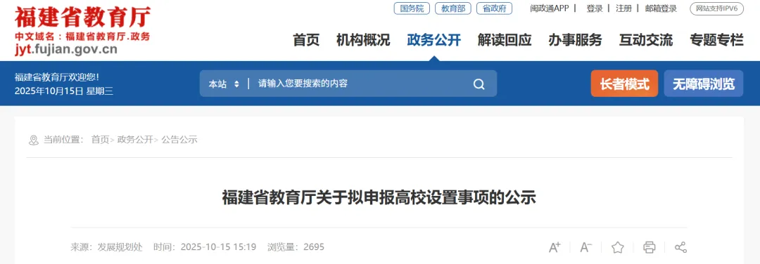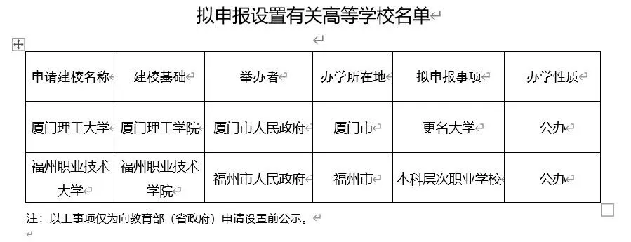 10月15日,福建省教育廳發(fā)布《關(guān)于擬申報高校設(shè)置事項的公示》,擬向教育部(省政府)申報廈門理工學(xué)院更名為廈門理工大學(xué)、在福州職業(yè)技術(shù)學(xué)院的基礎(chǔ)上建立福州職業(yè)技術(shù)大學(xué)。