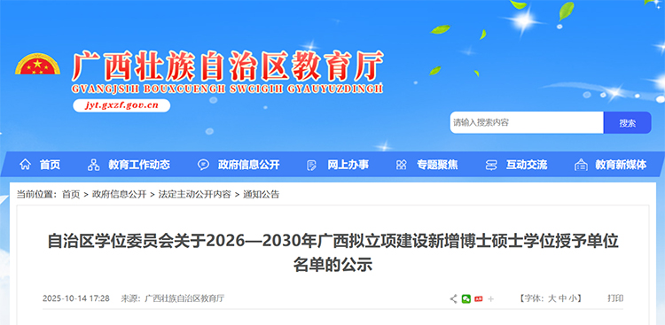 10月14日,廣西壯族自治區(qū)教育廳發(fā)布《自治區(qū)學(xué)位委員會(huì)關(guān)于2026—2030年廣西擬立項(xiàng)建設(shè)新增博士碩士學(xué)位授予單位名單的公示》。公示顯示,廣西科技大學(xué)等5所高校擬增列為博士學(xué)位授予立項(xiàng)建設(shè)單位,梧州學(xué)院等10所高校擬增列為碩士學(xué)位授予立項(xiàng)建設(shè)單位。