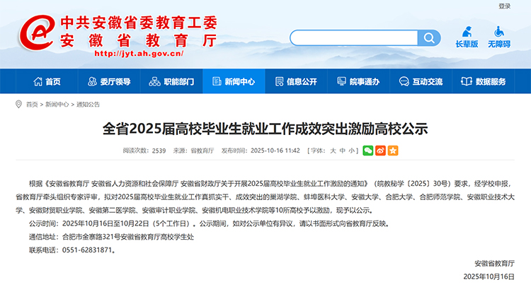 近日,安徽省教育廳發(fā)布《全省2025屆高校畢業(yè)生就業(yè)工作成效突出激勵高校公示》。經(jīng)學(xué)校申報,省教育廳牽頭組織專家評審,擬對2025屆高校畢業(yè)生就業(yè)工作真抓實干、成效突出的巢湖學(xué)院、蚌埠醫(yī)科大學(xué)、安徽大學(xué)、合肥大學(xué)、合肥師范學(xué)院、安徽職業(yè)技術(shù)大學(xué)、安徽財貿(mào)職業(yè)學(xué)院、安徽第二醫(yī)學(xué)院、安徽審計職業(yè)學(xué)院、安徽機電職業(yè)技術(shù)學(xué)院等10所高校予以激勵,現(xiàn)予以公示。