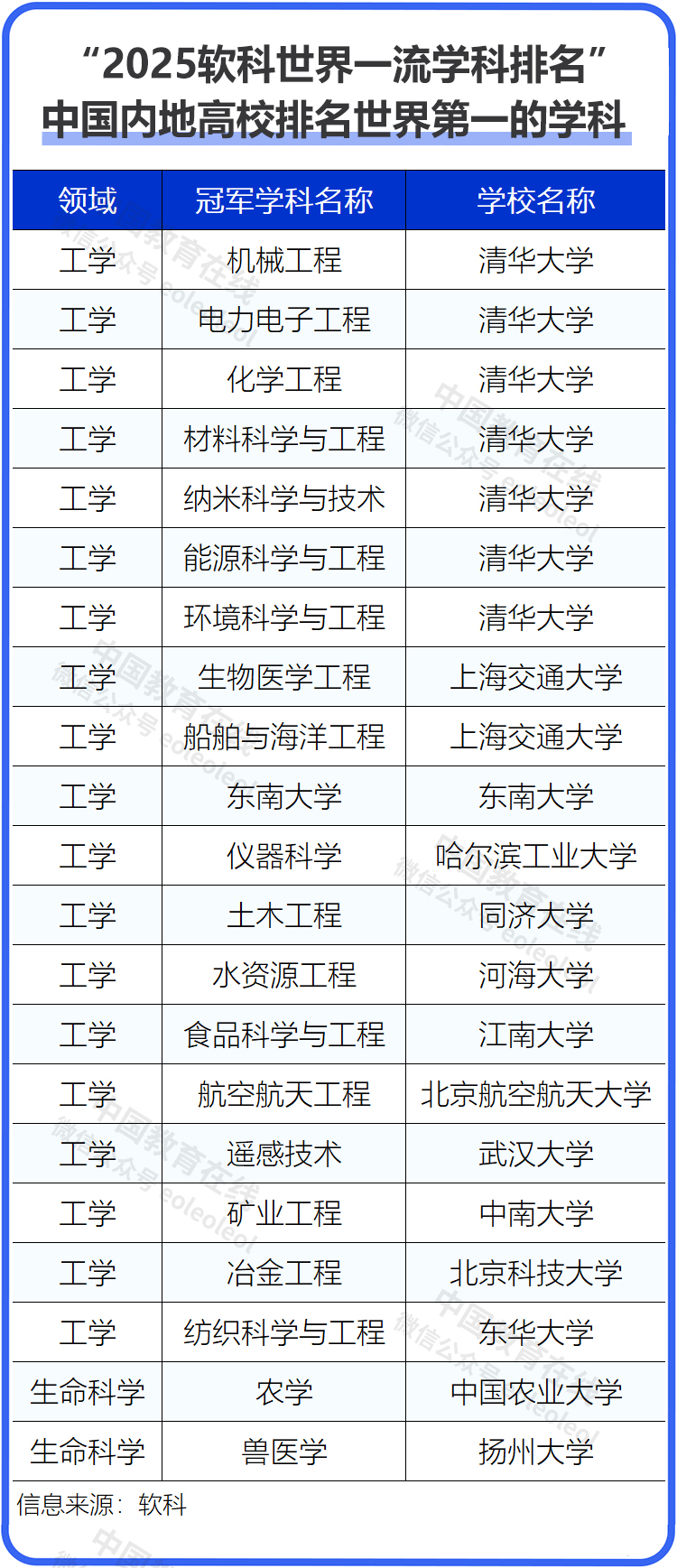 2025軟科世界一流學(xué)科排名中,中國內(nèi)地高校在電力電子工程、生物醫(yī)學(xué)工程、材料科學(xué)與工程3個學(xué)科首度問鼎世界第一,使得中國內(nèi)地高校的全球冠軍學(xué)科增加到21個。分別是清華大學(xué)(機械工程、電力電子工程、化學(xué)工程、材料科學(xué)與工程、納米科學(xué)與技術(shù)、能源科學(xué)與工程、環(huán)境科學(xué)與工程)、上海交通大學(xué)(生物醫(yī)學(xué)工程、船舶與海洋工程)、東南大學(xué)(通信工程)、哈爾濱工業(yè)大學(xué)(儀器科學(xué))、同濟大學(xué)(土木工程)、河海大學(xué)(水資源工程)、江南大學(xué)(食品科學(xué)與工程)、北京航空航天大學(xué)(航空航天工程)、武漢大學(xué)(遙感技術(shù))、中南大學(xué)(礦業(yè)工程)、北京科技大學(xué)(冶金工程)、東華大學(xué)(紡織科學(xué)與工程)、中國農(nóng)業(yè)大學(xué)(農(nóng)學(xué))、揚州大學(xué)(獸醫(yī)學(xué))。其中,揚州大學(xué)首次擁有全球冠軍學(xué)科。
