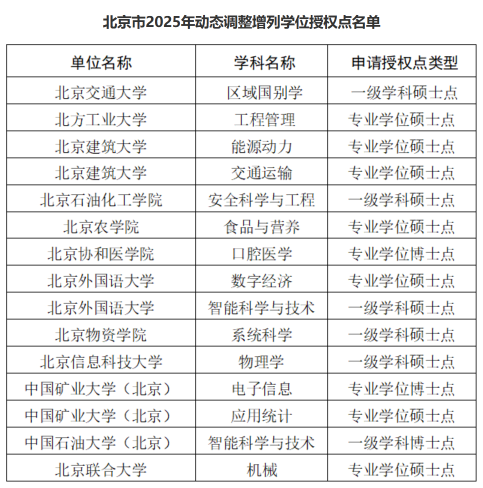 近日,經(jīng)北京市學(xué)位委員會委員會議審議,通過了2025年動態(tài)調(diào)整增列的碩士學(xué)位授權(quán)點(diǎn)名單。目前名單正在進(jìn)行公示,公示期為10個(gè)工作日(2025年12月5日至12月14日)。