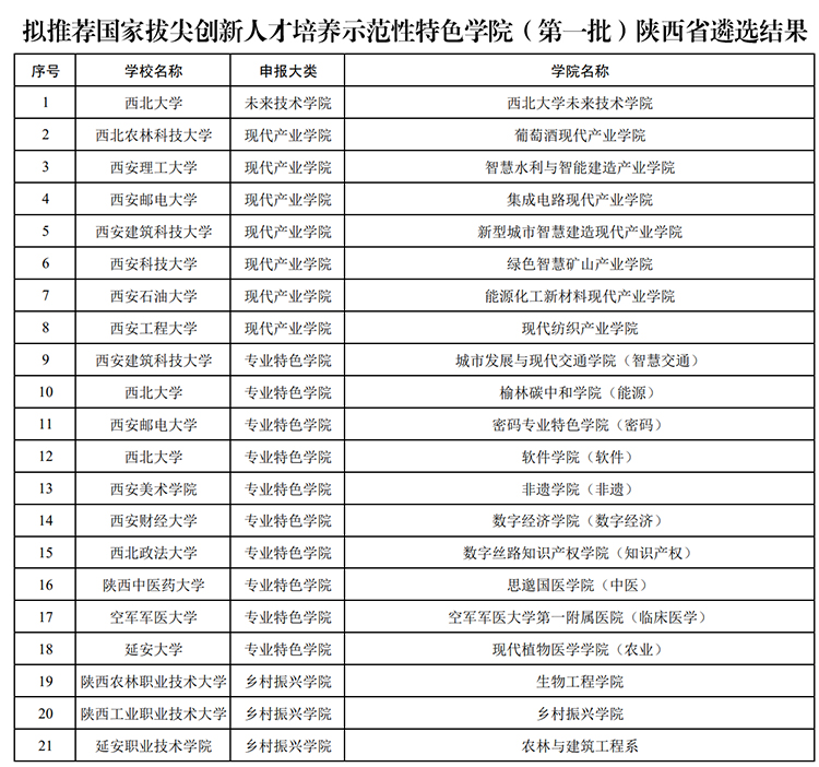 根據(jù)國家拔尖創(chuàng)新人才培養(yǎng)示范性特色學院遴選推薦工作安排,經(jīng)省級評議,擬推薦西北大學未來技術(shù)學院1個未來技術(shù)學院、西北農(nóng)林科技大學葡萄酒現(xiàn)代產(chǎn)業(yè)學院等7個現(xiàn)代產(chǎn)業(yè)學院、西安建筑科技大學城市發(fā)展與現(xiàn)代交通學院等10個專業(yè)特色學院、陜西農(nóng)林職業(yè)技術(shù)大學生物工程學院等3個鄉(xiāng)村振興學院參加教育部評選。