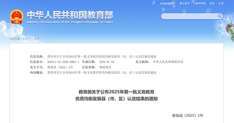 近日,教育部公布2025年第一批義務(wù)教育優(yōu)質(zhì)均衡發(fā)展縣(市、區(qū))認(rèn)定結(jié)果。