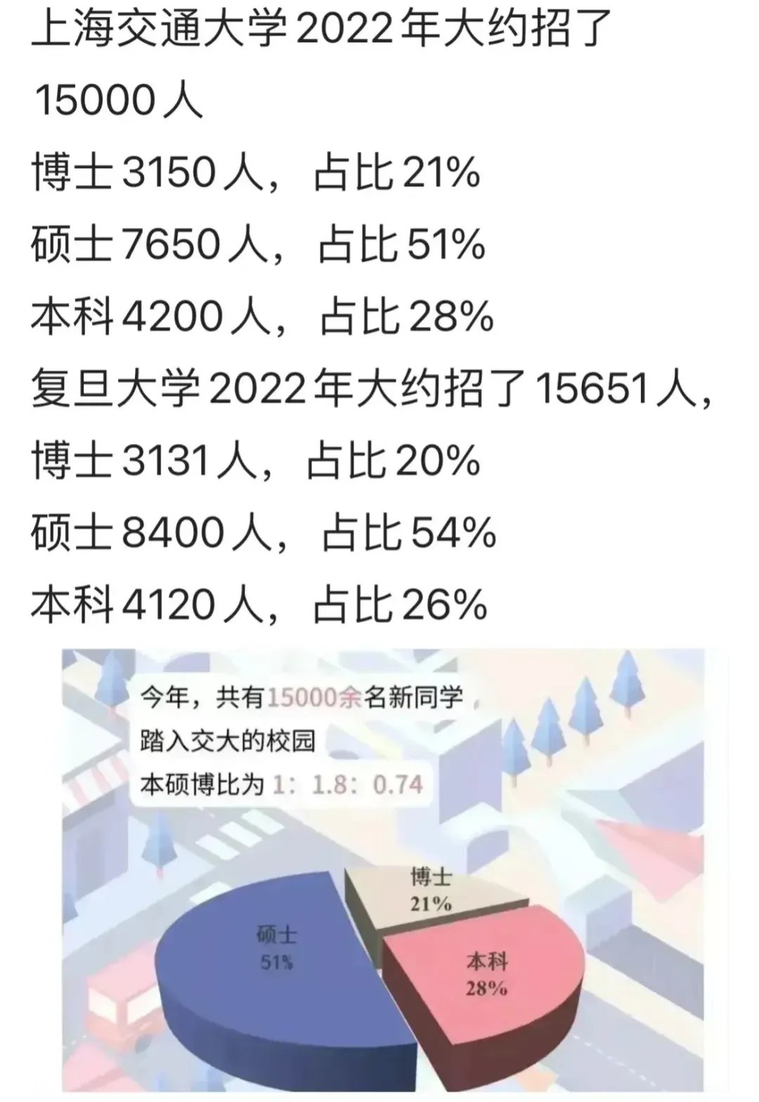 2022年新學年,上海交大招了大約15000人,其中博士碩士合計占比72%,本科生僅4200人,占比約28%。復旦大學2022年新生15651人,其中博士碩士占比74%,本科生僅4120人,占比約26%。北大清華也類似,本科生占比遠遠低于研究生。今年,清華本科生不足3800人,研究生近1萬人。