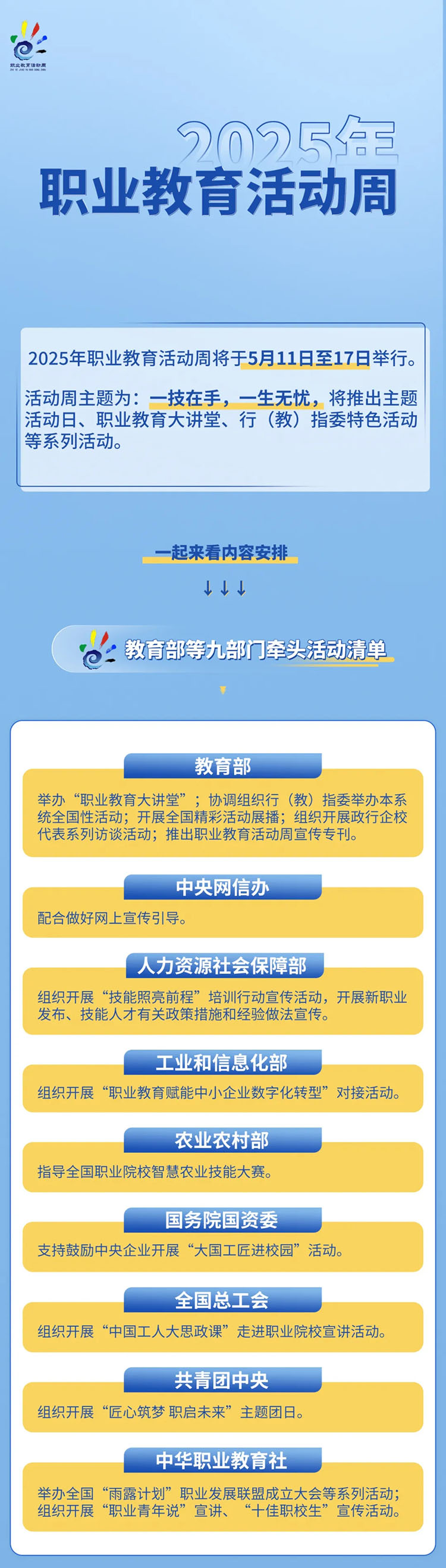 近日,教育部等九部門(mén)聯(lián)合印發(fā)《關(guān)于辦好2025年職業(yè)教育活動(dòng)周的通知》,部署啟動(dòng)2025年職業(yè)教育活動(dòng)周。今年職業(yè)教育活動(dòng)周時(shí)間為5月11日至17日,主題為“一技在手,一生無(wú)憂”。