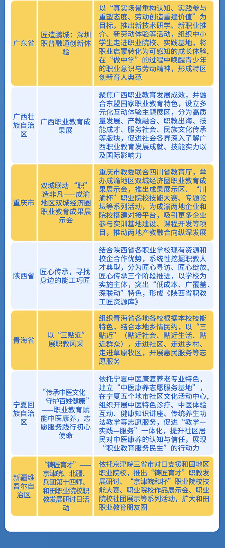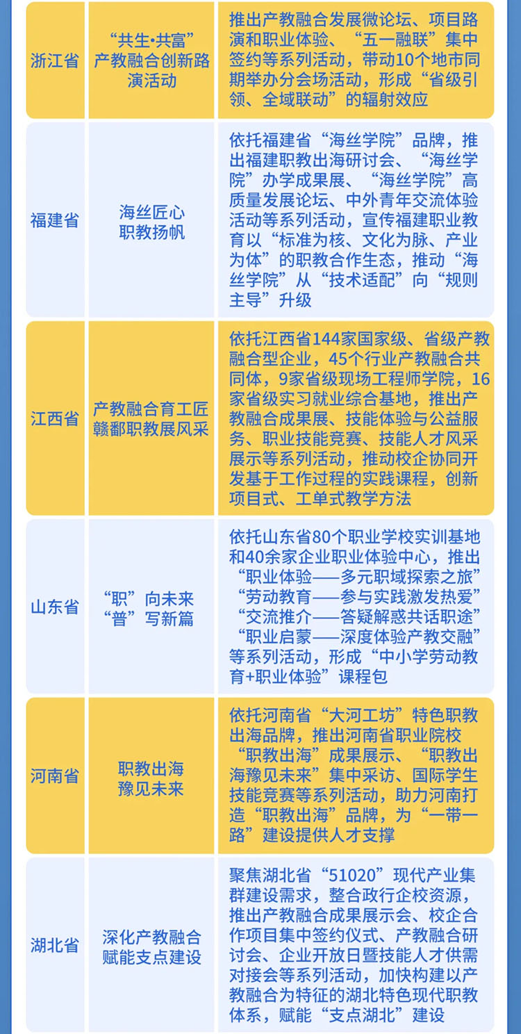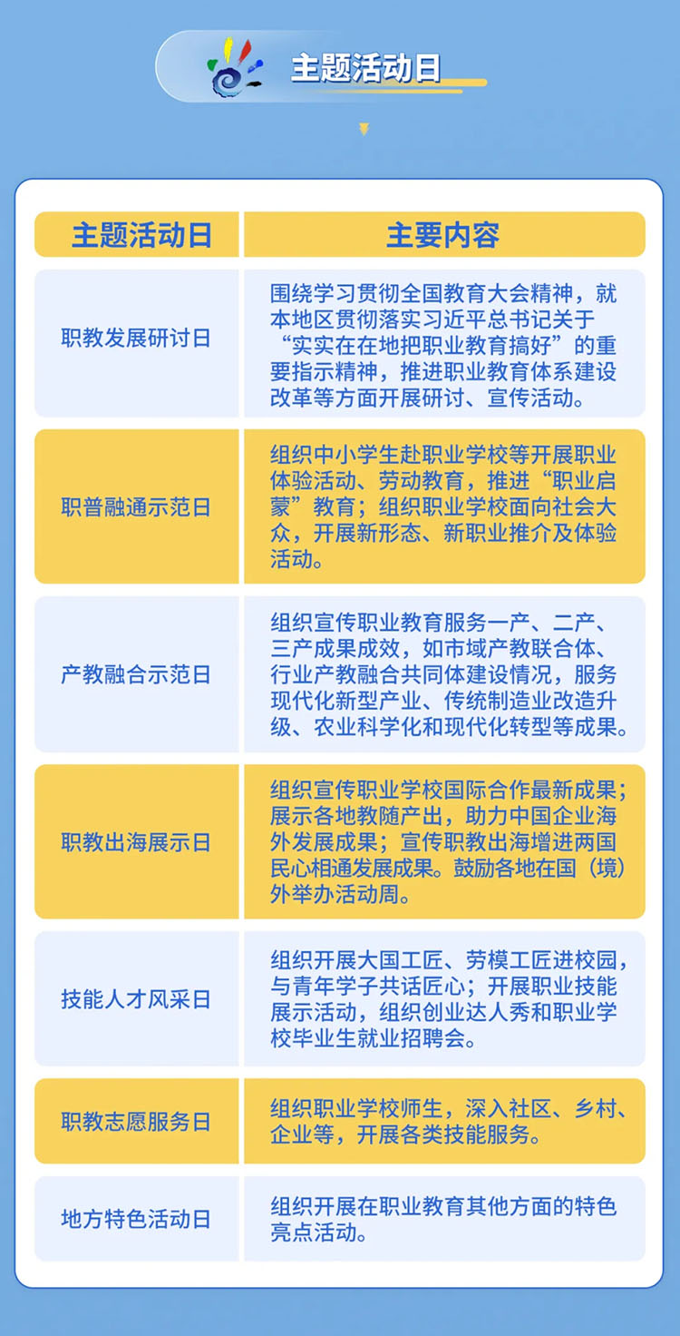《通知》指出,今年活動(dòng)周首次推出“主題活動(dòng)日”,分別是:“職教發(fā)展研討日”“職普融通示范日”“產(chǎn)教融合示范日”“職教出海展示日”“技能人才風(fēng)采日”“職教志愿服務(wù)日”以及“地方特色活動(dòng)日”,推動(dòng)各地各部門(mén)用好活動(dòng)周時(shí)長(zhǎng),合理安排不同宣傳主題,確保活動(dòng)周期間天天有活動(dòng)、精彩不斷線。