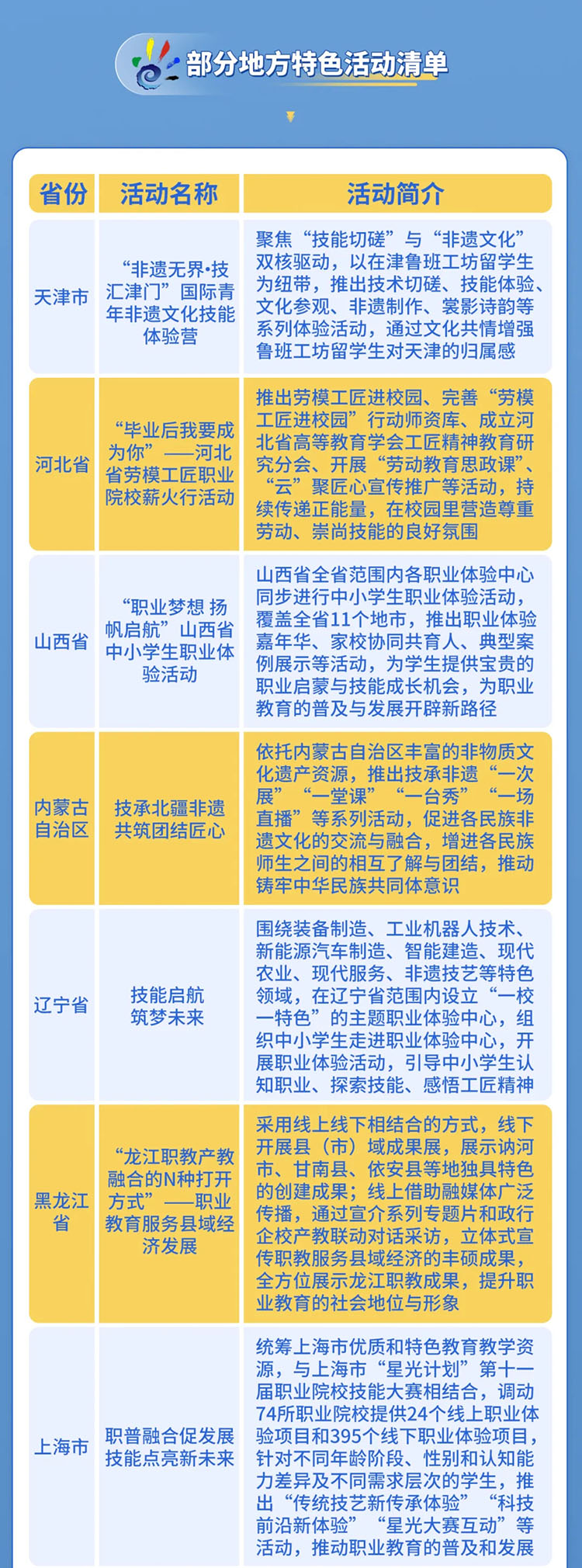 在地方性活動(dòng)方面,《通知》要求各地按照“七天主題活動(dòng)日”精心打造特色亮點(diǎn)活動(dòng),設(shè)計(jì)實(shí)施一批有含金量、辨識(shí)度、影響力的典型活動(dòng)。扎實(shí)做好“四開(kāi)放”(開(kāi)放企業(yè)、開(kāi)放校園、開(kāi)放院所、開(kāi)放賽場(chǎng))、“三貼近”(貼近社會(huì)、貼近生活、貼近群眾)、“兩走進(jìn)”(走進(jìn)社區(qū)、走進(jìn)鄉(xiāng)村)等常規(guī)性活動(dòng)。指導(dǎo)各職業(yè)學(xué)校認(rèn)真開(kāi)展活動(dòng)周,實(shí)現(xiàn)職業(yè)學(xué)校全覆蓋。