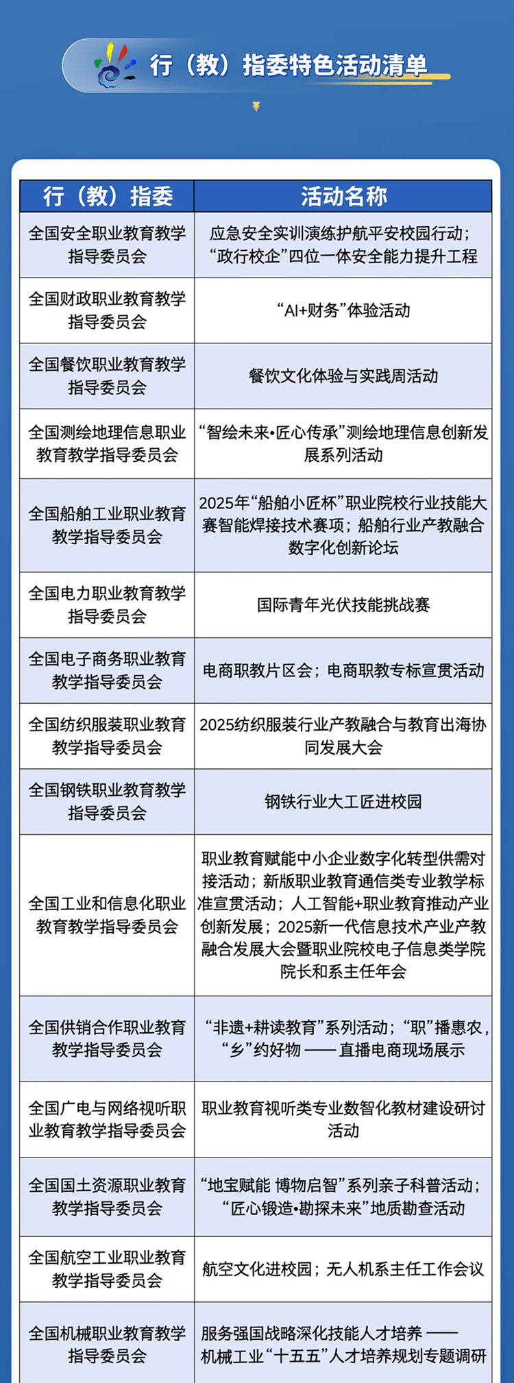 在全國(guó)性活動(dòng)方面,教育部等九部門(mén)分別在本系統(tǒng)內(nèi)牽頭組織開(kāi)展“職業(yè)教育大講堂”、“技能照亮前程”培訓(xùn)行動(dòng)宣傳、“職業(yè)教育賦能中小企業(yè)數(shù)字化轉(zhuǎn)型”對(duì)接、全國(guó)職業(yè)院校智慧農(nóng)業(yè)技能大賽、“大國(guó)工匠進(jìn)校園”、“中國(guó)工人大思政課”走進(jìn)職業(yè)院校、“匠心筑夢(mèng) 職啟未來(lái)”主題團(tuán)日、全國(guó)“雨露計(jì)劃”職業(yè)發(fā)展聯(lián)盟成立大會(huì)等14項(xiàng)全國(guó)性活動(dòng)。此外,教育部組織43個(gè)全國(guó)行業(yè)職業(yè)教育教學(xué)指導(dǎo)委員會(huì)精心設(shè)計(jì)了80余項(xiàng)各行業(yè)全國(guó)性特色活動(dòng)。