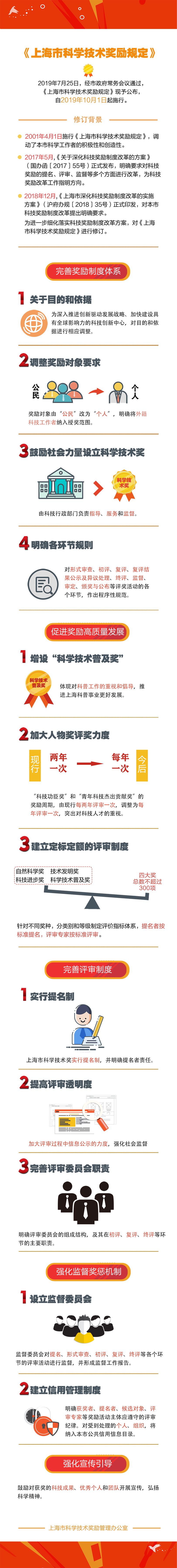 《上海市科學技術(shù)獎勵規(guī)定》自2001年4月1日起施行以來,對調(diào)動本市科技工作者的積極性和創(chuàng)造性發(fā)揮了重要作用。按照《關(guān)于深化科技獎勵制度改革的方案》(國辦函〔2017〕55號)要求,上海開展了本市科技獎勵制度改革工作,并于2018年出臺了《上海市深化科技獎勵制度改革的實施方案》。為進一步細化落實改革方案,按照市政府立法工作計劃,市科委會同市司法局開展了《規(guī)定》的相關(guān)修訂工作。修訂后的《規(guī)定》經(jīng)2019年7月25日市政府第59次常務(wù)會議通過,現(xiàn)正式公布啦,將于2019年10月1日起施行。