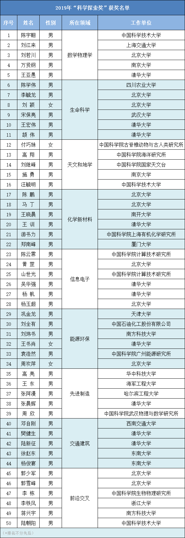 2019年度“科學(xué)探索獎(jiǎng)”獲獎(jiǎng)人來自全國11個(gè)省市的26個(gè)科研單位、高校和企業(yè)。為了選拔和激勵(lì)更多青年科技工作者,經(jīng)過評(píng)審委員會(huì)決定,在獎(jiǎng)項(xiàng)評(píng)審中采用“新星機(jī)制”——在同等申報(bào)條件下,年紀(jì)更輕者勝出。最終50位獲獎(jiǎng)人中,35歲及以下獲獎(jiǎng)人有9位,比例接近20%,充分體現(xiàn)了該獎(jiǎng)項(xiàng)激勵(lì)青年科技工作者的初衷。