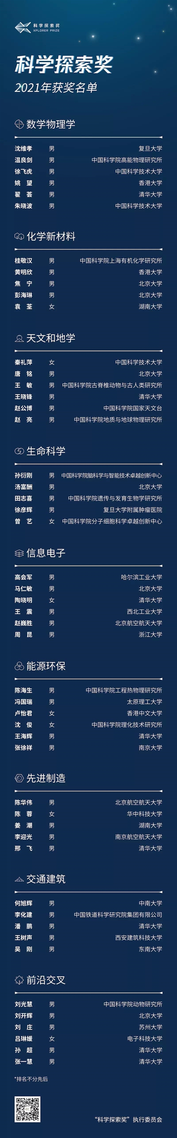 9月13日,啟動資金高達10億元的“科學探索獎”正式公布第三屆獲獎名單,50位青年科學家上榜。