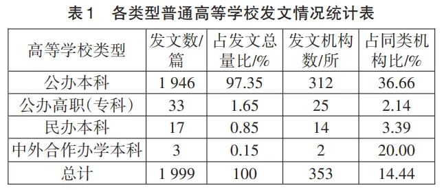 在納入統(tǒng)計(jì)范圍的2151篇高等教育科研論文中,剔除第一作者署名單位為境外高校(含港澳臺(tái))以及政府機(jī)關(guān)、教育服務(wù)機(jī)構(gòu)、科研院所、軍事院校等的文章152篇,獲得第一作者署名單位為境內(nèi)普通高校的高等教育科研論文共計(jì)1999篇,以此作為本分析報(bào)告的數(shù)據(jù)基礎(chǔ)。