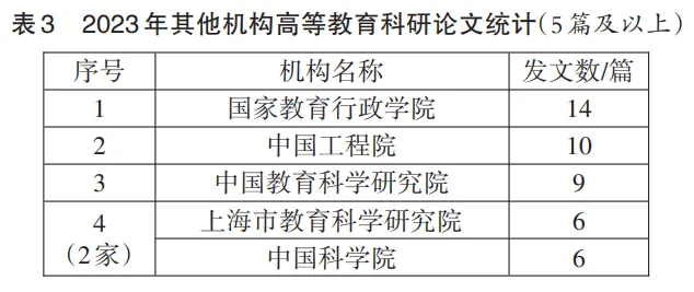 2023年,共有89家其他類機(jī)構(gòu)在23家期刊發(fā)表論文152篇,機(jī)構(gòu)平均發(fā)文1.71篇。共有5家機(jī)構(gòu)發(fā)文在5篇及以上,合計(jì)發(fā)文45篇,占其他機(jī)構(gòu)發(fā)文總量的29.61%,(見(jiàn)表3)共有10家機(jī)構(gòu)發(fā)文3篇及以上,合計(jì)發(fā)文63篇,占比41.45%。