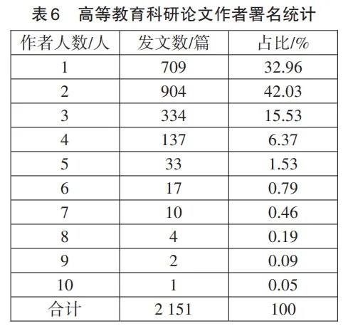 在統(tǒng)計(jì)作者署名情況的2151篇論文中,兩人聯(lián)合署名是占比最高的署名形式,其次為單獨(dú)署名。統(tǒng)計(jì)發(fā)現(xiàn),聯(lián)合署名的總占比達(dá)67.04%,這顯示出高等教育科研活動(dòng)中合作研究已經(jīng)成為主流方式,呈現(xiàn)出有組織科研的雛形。高等教育學(xué)科發(fā)展進(jìn)入成熟化階段,跨學(xué)科、跨主體的研究越來(lái)越深入,采用多樣化的研究方法、多學(xué)科的研究視角、多主體的信息采集方式使得不同背景的研究者組建起復(fù)合型研究團(tuán)隊(duì)開(kāi)展更深入、更廣闊的有組織研究。(見(jiàn)表6)以團(tuán)隊(duì)形態(tài)開(kāi)展的高等教育研究主題值得進(jìn)一步分析挖掘,以反映高等教育科研的深層次結(jié)構(gòu)。