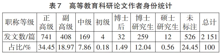 在職稱方面,論文統(tǒng)計(jì)顯示作者隊(duì)伍中具有副高級(jí)及以上職稱的人員比例較高,合計(jì)占比達(dá)到53.42%。在被統(tǒng)計(jì)的2151篇論文中,有1625篇論文的作者有職稱說(shuō)明。如按照有標(biāo)注職稱說(shuō)明的論文作為基數(shù)計(jì)算,擁有高級(jí)職稱的占比為70.71%。除此之外,博士研究生的占比也較高。(見(jiàn)表7)由此反映出高影響力學(xué)術(shù)期刊凝聚著一批以資深專家學(xué)者為主要研究力量和以博士研究生群體為新生代力量的研究隊(duì)伍。