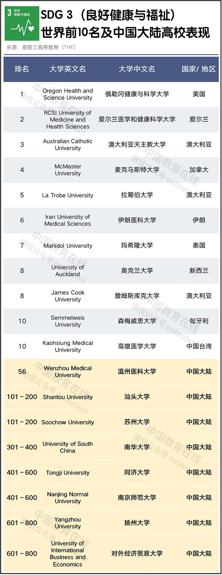 在SDG的單項排名中,溫州醫(yī)科大學(xué)在SDG3(良好的健康與福祉)在全球排名第56名。三所中國大陸高校在SDG6的單項排名中排名世界前100名,他們分別是同濟(jì)大學(xué)(第33名)和首次亮相的南方科技大學(xué)(第65名)和上海大學(xué)(第76名)。