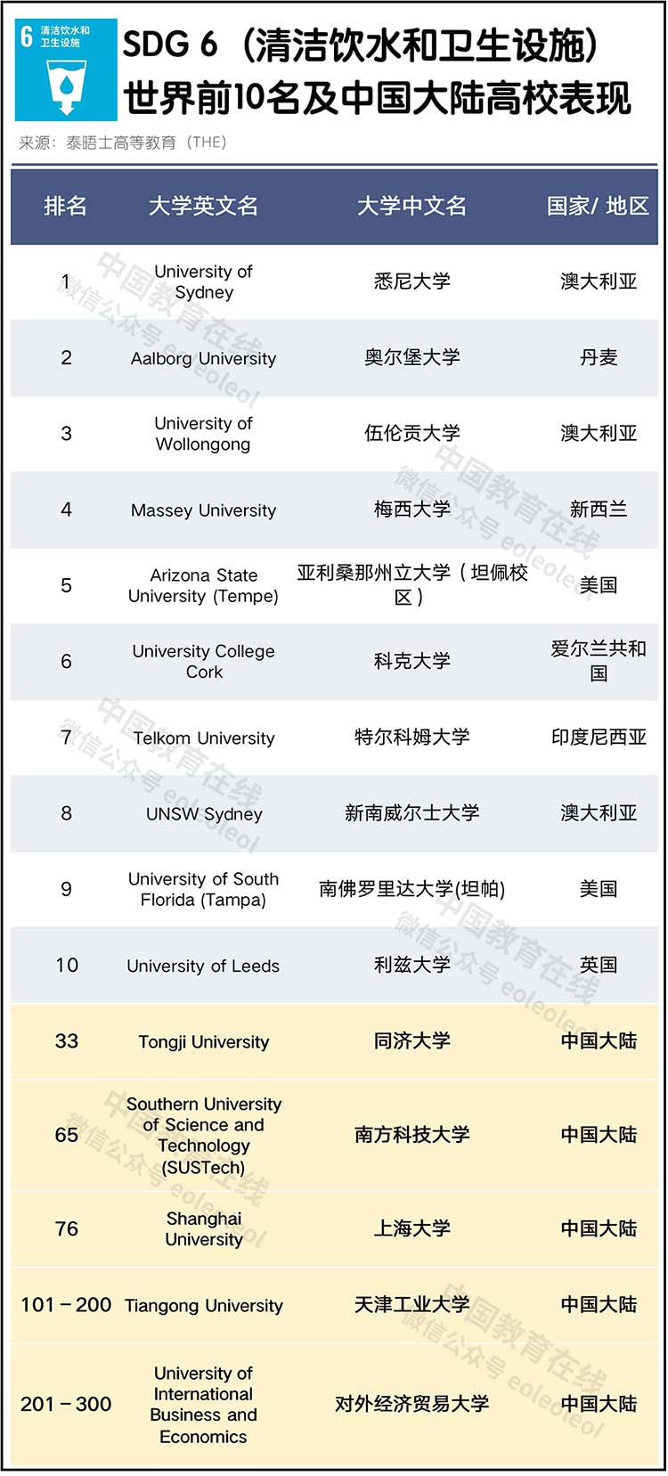 在SDG6(清潔飲水與衛(wèi)生設(shè)施)的單項排名中,有三所中國大陸高校排名世界前100名,其中包括兩所初次參加排名的大學(xué):南方科技大學(xué)(第65名)和上海大學(xué)(第76名)