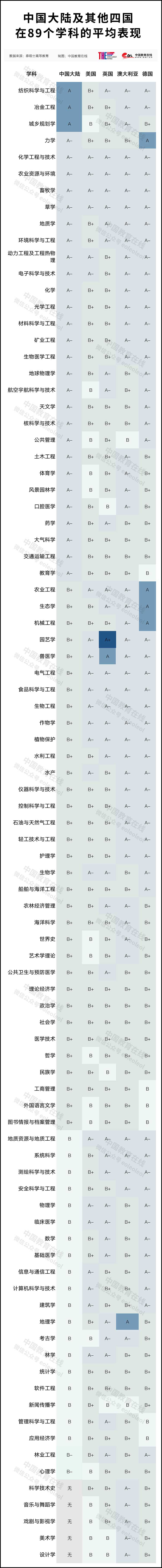 評(píng)級(jí)結(jié)果還表明,中國(guó)大陸高校在五個(gè)學(xué)科取得了成功:冶金工程(A)、城鄉(xiāng)規(guī)劃(A)、大氣科學(xué)(A-)、交通工程(A-)和教育學(xué)(A-)的評(píng)級(jí)均優(yōu)于英國(guó)、美國(guó)、加拿大、澳大利亞和德國(guó)。