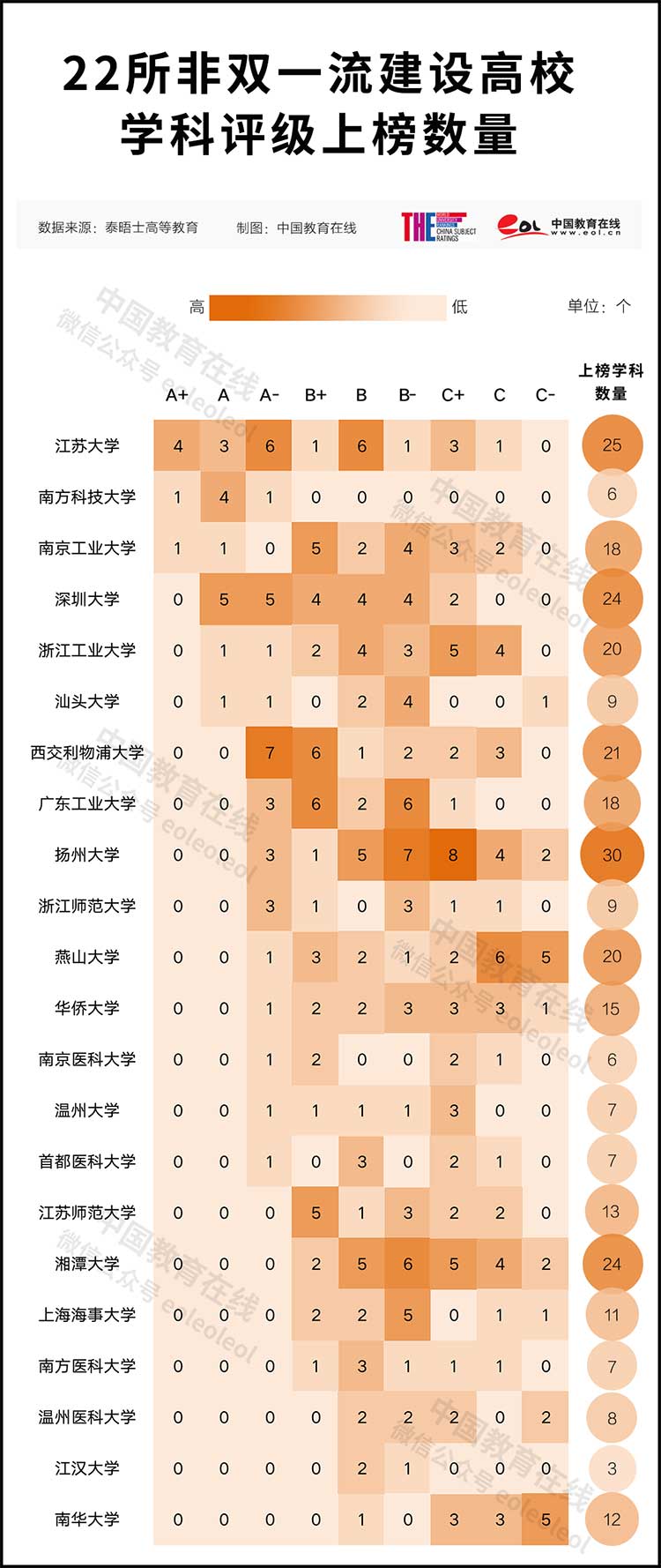 值得一提的是,本次有22所非“雙一流”高校參與學(xué)科評(píng)級(jí),其中,揚(yáng)州大學(xué)上榜學(xué)科數(shù)量最多,達(dá)30個(gè)。江蘇大學(xué)上榜學(xué)科總數(shù)其次,有25個(gè),且多集中于A類(lèi),13個(gè)A類(lèi)學(xué)科中有4個(gè)A+學(xué)科,在非“雙一流”高校中表現(xiàn)不俗。南方科技大學(xué)、南京工業(yè)大學(xué)也分別有1個(gè)學(xué)科入選A+。