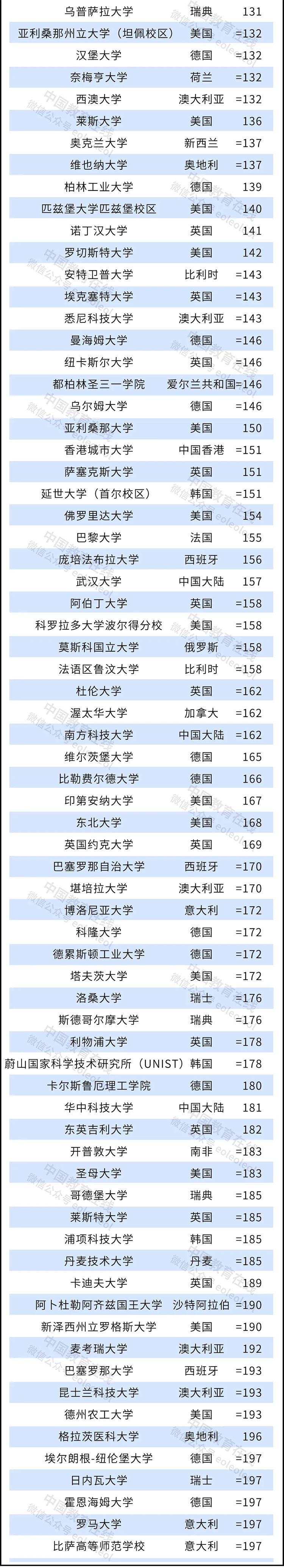 武漢大學(xué)(第 157 名)、南方科技大學(xué)(第 162名)和華中科技大學(xué)(第 181 名)為首次進入前200名的高校。