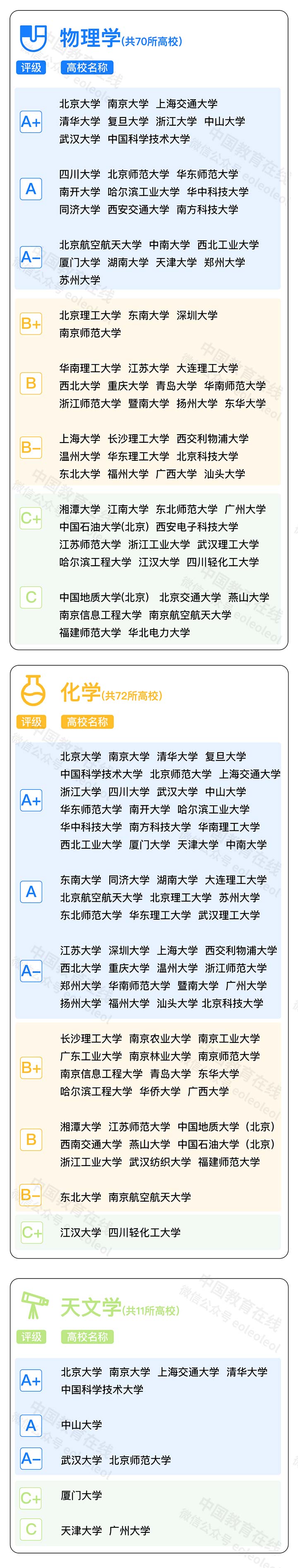 中國(guó)大陸有5所高校的天文學(xué)評(píng)級(jí)達(dá)到A+,分別為北京大學(xué)、南京大學(xué)、上海交通大學(xué)、清華大學(xué)和中國(guó)科學(xué)技術(shù)大學(xué)??傮w而言,有21所中國(guó)大陸高校在至少一門理學(xué)學(xué)科中獲得A+評(píng)級(jí)。