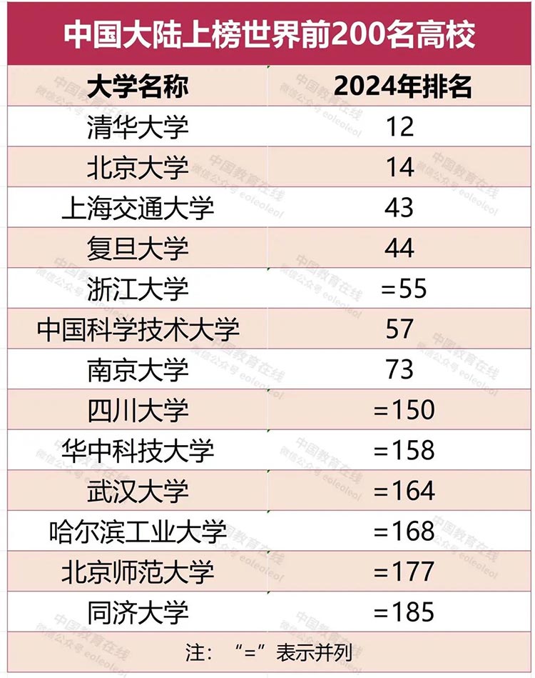 本屆排名,中國大陸有兩所大學(xué)進(jìn)入前20名,7所大學(xué)進(jìn)入前100名,13所大學(xué)進(jìn)入前200名。在六年前發(fā)布的2018年世界大學(xué)排名中,中國大陸僅有兩所大學(xué)進(jìn)入前100名。在過去的五年中,中國大陸高校在世界范圍內(nèi)進(jìn)步最大,總平均分從2020年的35.5分上升到2024年的48.9分。