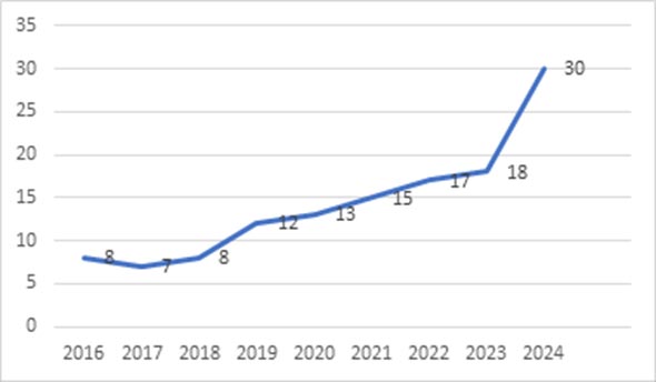 2016年至2024年中國大陸高校進(jìn)入泰晤士高等教育世界大學(xué)排名世界前400名的高校數(shù)量趨勢