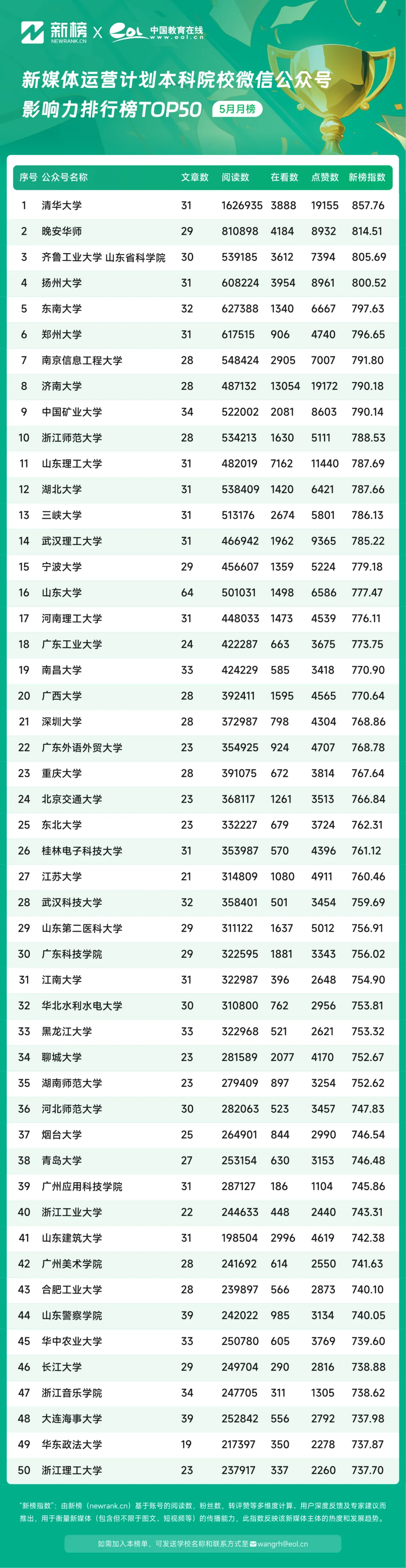 5月,中國(guó)教育在線新媒體運(yùn)營(yíng)計(jì)劃本科院校微信公眾號(hào)影響力排行榜TOP50中,@清華大學(xué)公眾號(hào)憑借857.76的新榜指數(shù)躍居榜單第一,@晚安華師憑借814.51的影響力指數(shù)位居第二,@齊魯工業(yè)大學(xué)以805.69的影響力指數(shù)位居榜單第三。