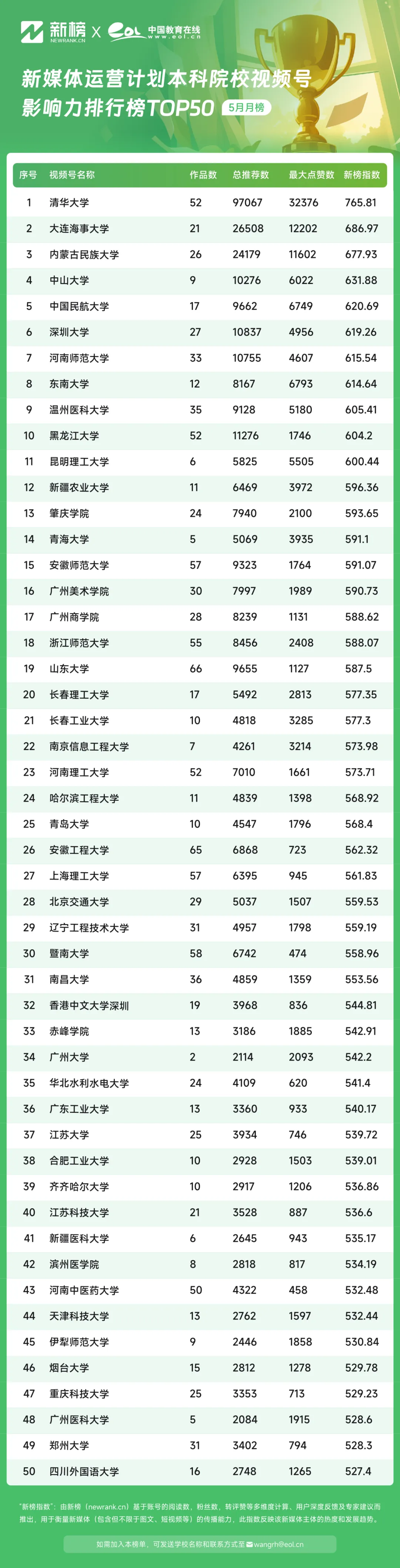 5月,中國(guó)教育在線新媒體運(yùn)營(yíng)計(jì)劃本科院校微信視頻號(hào)影響力排行榜TOP50中,@清華大學(xué)視頻號(hào)憑借765.81的新榜指數(shù)躍居榜單第一,@大連海事大學(xué)憑借686.97的影響力指數(shù)位居第二,@內(nèi)蒙古民族大學(xué)以677.93的影響力指數(shù)位居榜單第三。
