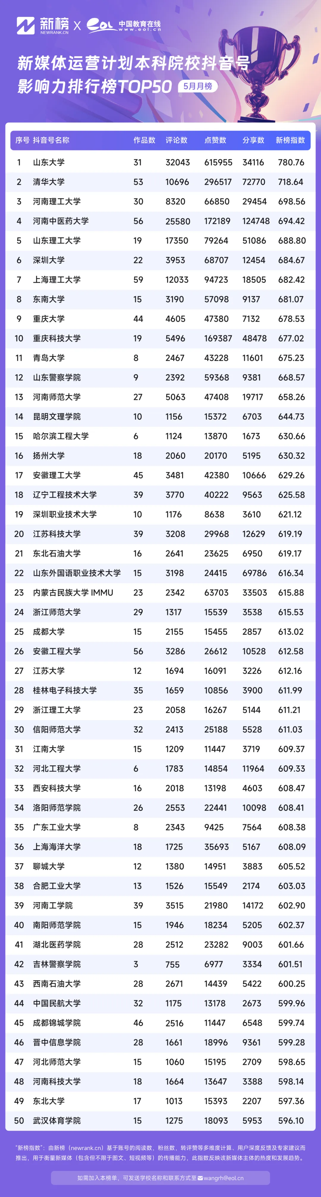 5月,中國(guó)教育在線新媒體運(yùn)營(yíng)計(jì)劃本科院校微信抖音號(hào)影響力排行榜TOP50中,@山東大學(xué)抖音號(hào)憑借780.76的新榜指數(shù)躍居榜單第一,@清華大學(xué)憑借718.64的影響力指數(shù)位居第二,@河南理工大學(xué)以698.56的影響力指數(shù)位居榜單第三。