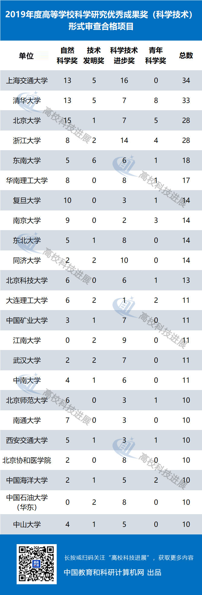 科學(xué)技術(shù)進步獎共有422項(通用項目406項,專用項目16項)形式審查合格。在通用項目的統(tǒng)計結(jié)果中,共有167所高校以第一完成單位牽頭的項目通過審查。形式審查合格項目較多的高校分別是上海交通大學(xué)16項,浙江大學(xué)14項,同濟大學(xué)10項,江南大學(xué)9項,北京協(xié)和醫(yī)學(xué)院、東北大學(xué)和中國石油大學(xué)(華東)均為8項,北京大學(xué)、清華大學(xué)、武漢大學(xué)和中國礦業(yè)大學(xué)各有7項,北京科技大學(xué)、東南大學(xué)、中南大學(xué)、首都醫(yī)科大學(xué)、江蘇大學(xué)分別有6項,北京林業(yè)大學(xué)、中國礦業(yè)大學(xué)(北京)、中國醫(yī)科大學(xué)、河海大學(xué)、中國海洋大學(xué)、華中科技大學(xué)、中山大學(xué)、華南理工大學(xué)、中國人民解放軍海軍軍醫(yī)大學(xué)以及五邑大學(xué)各有5項。