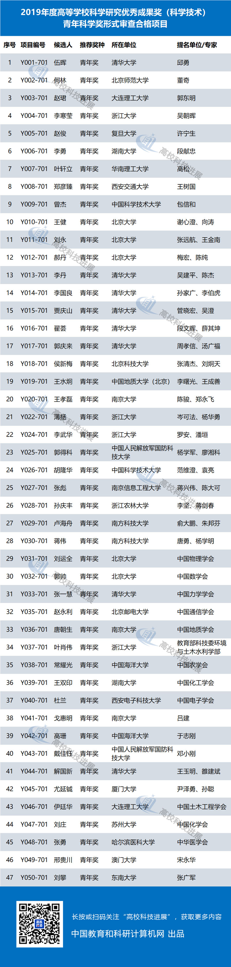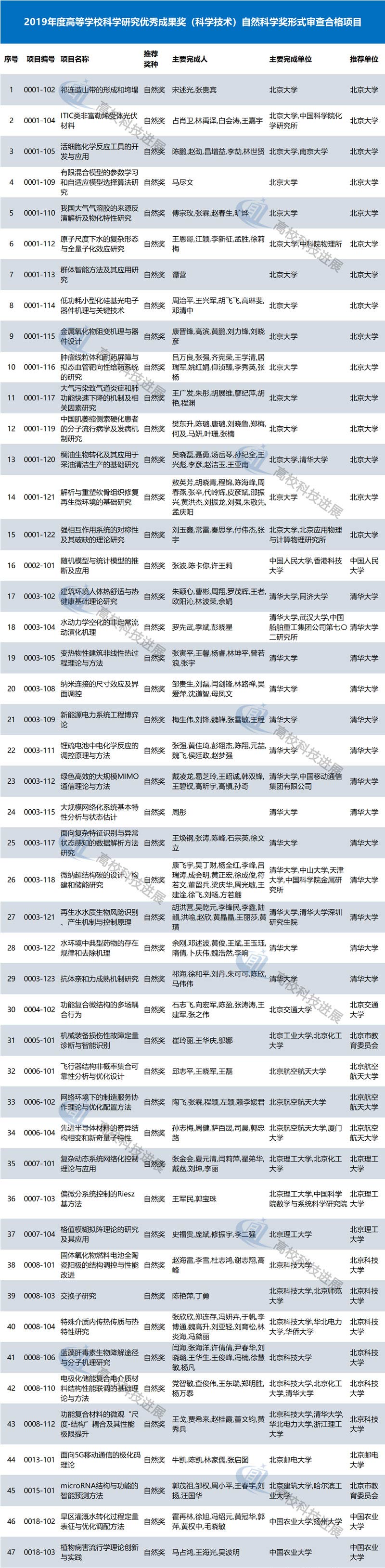 7月22日,2019年度高等學(xué)校科學(xué)研究優(yōu)秀成果獎(科學(xué)技術(shù))推薦/提名工作已結(jié)束。教育部科技司組織對候選項目/候選人進行了形式審查,確定形式審查合格941項/人(含專用項目32項),不合格92項,形式審查過程中,推薦/提名單位或?qū)<姨岢龀蜂N推薦/提名13項。形式審查合格項目中,自然科學(xué)獎347項,技術(shù)發(fā)明獎125項(通用項目109項,專用項目16項),科學(xué)技術(shù)進步獎422項(通用項目406項,專用項目16項),青年科學(xué)獎候選人47人。