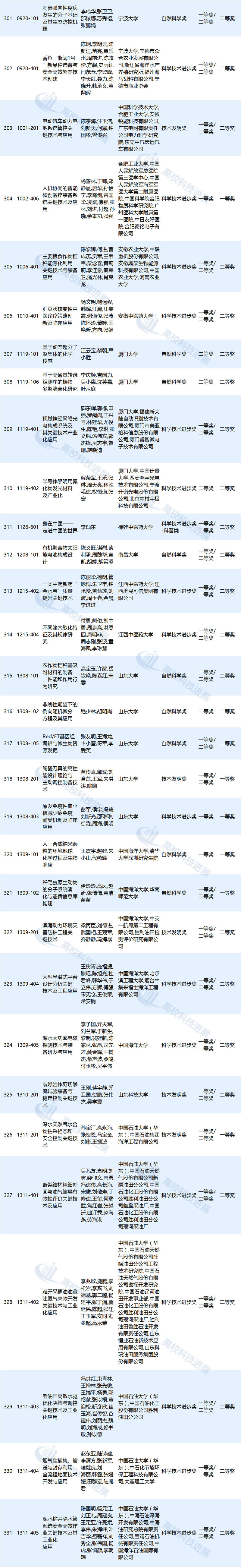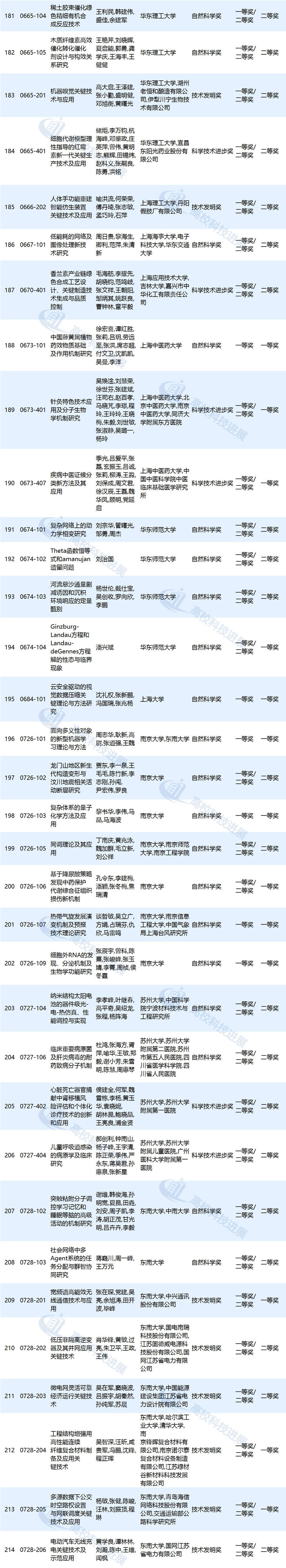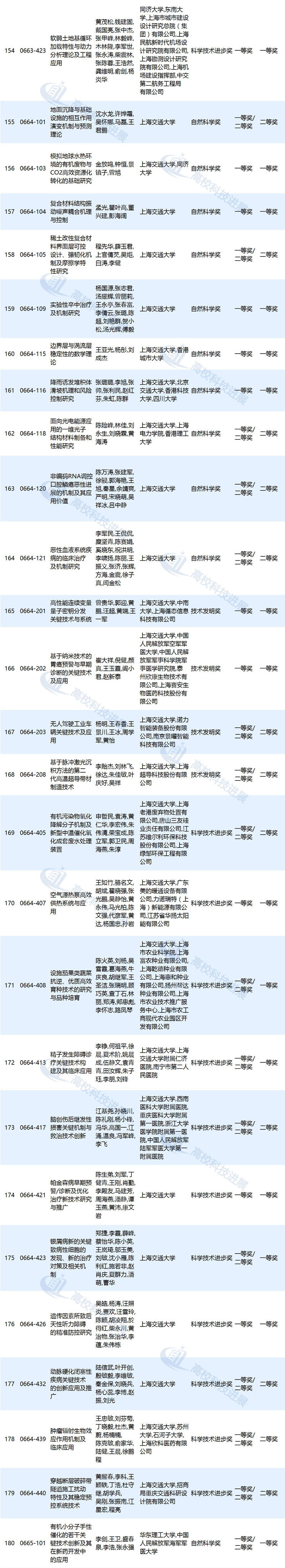 作為第一完成單位,上海交通大學(xué)獲獎(jiǎng)項(xiàng)目為25項(xiàng),清華大學(xué)獲獎(jiǎng)項(xiàng)目為20項(xiàng),北京大學(xué)、浙江大學(xué)獲獎(jiǎng)項(xiàng)目分別為17項(xiàng),東南大學(xué)獲獎(jiǎng)項(xiàng)目為11項(xiàng),東北大學(xué)獲獎(jiǎng)項(xiàng)目為9項(xiàng),中國(guó)農(nóng)業(yè)大學(xué)、同濟(jì)大學(xué)、江南大學(xué)、中國(guó)石油大學(xué)(華東)等高校獲獎(jiǎng)項(xiàng)目分別為8項(xiàng),大連理工大學(xué)、復(fù)旦大學(xué)、南京大學(xué)等高校獲獎(jiǎng)項(xiàng)目分別為7項(xiàng),武漢大學(xué)、華南理工大學(xué)、四川大學(xué)等高校獲獎(jiǎng)項(xiàng)目分別為6項(xiàng),北京航空航天大學(xué)、華東理工大學(xué)、山東大學(xué)等高校獲獎(jiǎng)項(xiàng)目分別為5項(xiàng),北京科技大學(xué)、北京林業(yè)大學(xué)、北京協(xié)和醫(yī)學(xué)院等高校獲獎(jiǎng)項(xiàng)目分別為4項(xiàng)(高校獲獎(jiǎng)情況詳見(jiàn)文末附表)。