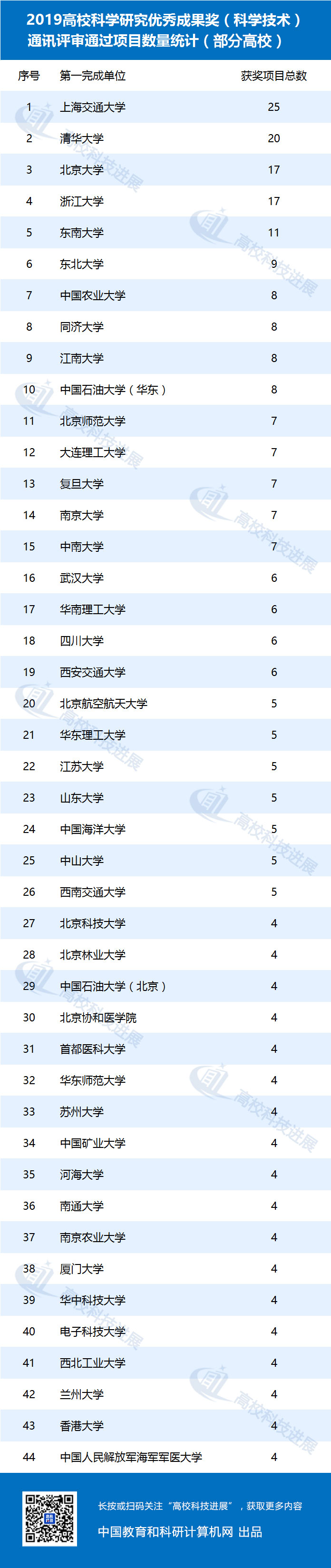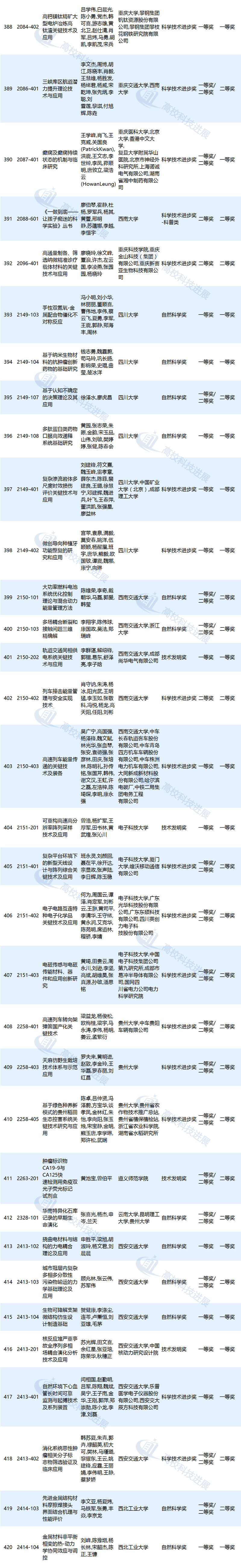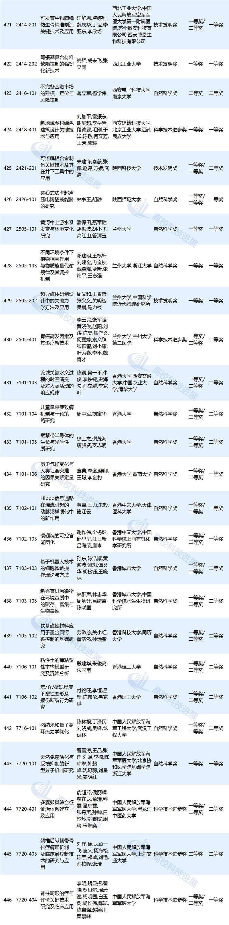 作為第一完成單位,上海交通大學(xué)獲獎(jiǎng)項(xiàng)目為25項(xiàng),清華大學(xué)獲獎(jiǎng)項(xiàng)目為20項(xiàng),北京大學(xué)、浙江大學(xué)獲獎(jiǎng)項(xiàng)目分別為17項(xiàng),東南大學(xué)獲獎(jiǎng)項(xiàng)目為11項(xiàng),東北大學(xué)獲獎(jiǎng)項(xiàng)目為9項(xiàng),中國(guó)農(nóng)業(yè)大學(xué)、同濟(jì)大學(xué)、江南大學(xué)、中國(guó)石油大學(xué)(華東)等高校獲獎(jiǎng)項(xiàng)目分別為8項(xiàng),大連理工大學(xué)、復(fù)旦大學(xué)、南京大學(xué)等高校獲獎(jiǎng)項(xiàng)目分別為7項(xiàng),武漢大學(xué)、華南理工大學(xué)、四川大學(xué)等高校獲獎(jiǎng)項(xiàng)目分別為6項(xiàng),北京航空航天大學(xué)、華東理工大學(xué)、山東大學(xué)等高校獲獎(jiǎng)項(xiàng)目分別為5項(xiàng),北京科技大學(xué)、北京林業(yè)大學(xué)、北京協(xié)和醫(yī)學(xué)院等高校獲獎(jiǎng)項(xiàng)目分別為4項(xiàng)(高校獲獎(jiǎng)情況詳見(jiàn)文末附表)。