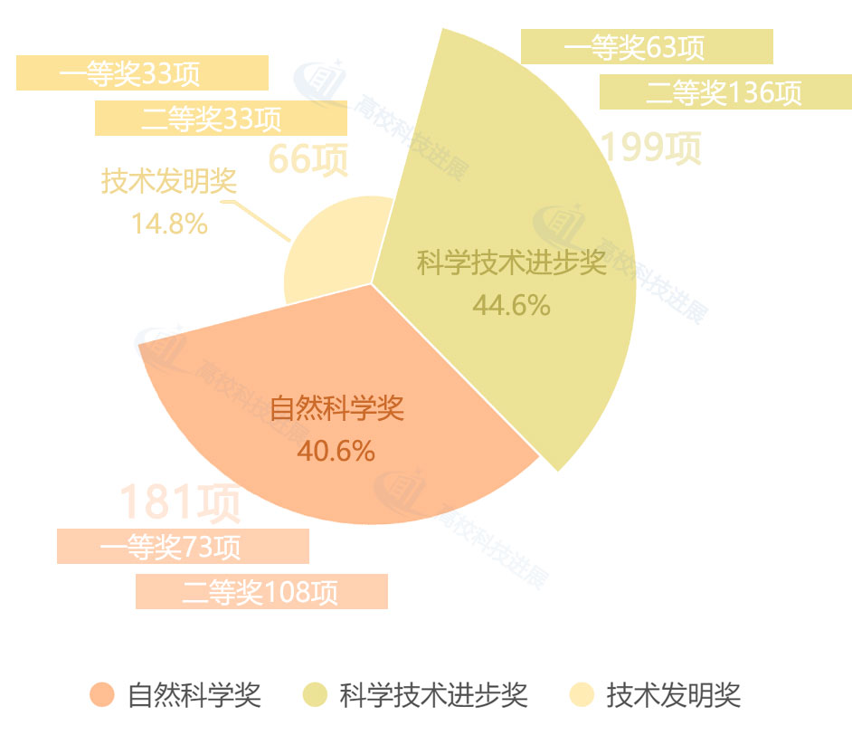 從授獎(jiǎng)等級(jí)情況來(lái)看,在通過(guò)評(píng)審的項(xiàng)目中,高校獲評(píng)一等獎(jiǎng)和二等獎(jiǎng)的項(xiàng)目數(shù)量分別為169項(xiàng)、277項(xiàng)。其中,自然科學(xué)獎(jiǎng)獲評(píng)一等獎(jiǎng)和二等獎(jiǎng)的項(xiàng)目分別為73項(xiàng)、108項(xiàng),科學(xué)技術(shù)進(jìn)步獎(jiǎng)獲評(píng)一等獎(jiǎng)和二等獎(jiǎng)的項(xiàng)目分別為63項(xiàng)、136項(xiàng),技術(shù)發(fā)明獎(jiǎng)獲評(píng)一等獎(jiǎng)、二等獎(jiǎng)的項(xiàng)目數(shù)均為33項(xiàng),自然科學(xué)獎(jiǎng)獲評(píng)一等獎(jiǎng)的項(xiàng)目數(shù)量高于科學(xué)技術(shù)進(jìn)步獎(jiǎng)和技術(shù)發(fā)明獎(jiǎng)。