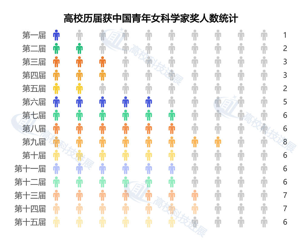 根據(jù)數(shù)據(jù)統(tǒng)計,高校獲“中國青年女科學(xué)家獎”人數(shù)逐年增多,自第七屆開始,獲獎人數(shù)穩(wěn)定在6人以上??梢钥吹街袊艹雠钥茖W(xué)家人數(shù)在逐漸增多。