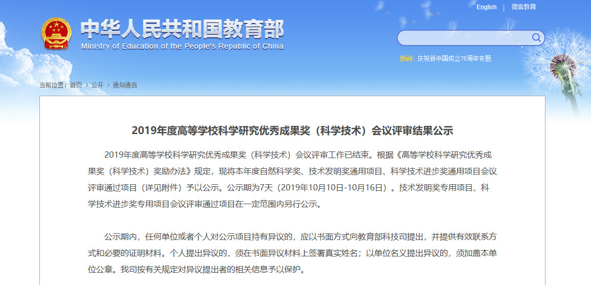 10月10日,教育部科技司正式對外公示2019年度高等學校科學研究優(yōu)秀成果獎(科學技術)(以下簡稱“優(yōu)秀成果獎”)會議評審結果。本次評審出的自然科學獎121個、技術發(fā)明獎通用項目45個、科學技術進步獎通用項目129個,共計295個獎項。