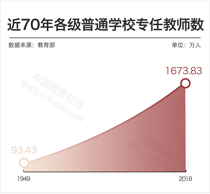 近些年來,我國教師隊伍不斷壯大。根據(jù)教育部公布的數(shù)據(jù)顯示,全國現(xiàn)有各級各類專任教師1673.83萬人,比1949年的94.43萬人增長近17倍,這個龐大的職業(yè)群體支撐起世界上最大規(guī)模的教育體系。