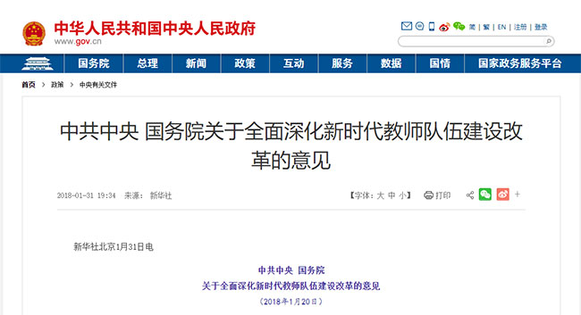 2018年1月20日,中共中央、國務院印發(fā)《關于全面深化新時代教師隊伍建設改革的意見》,提出要“不斷提高地位待遇,真正讓教師成為令人羨慕的職業(yè)”。