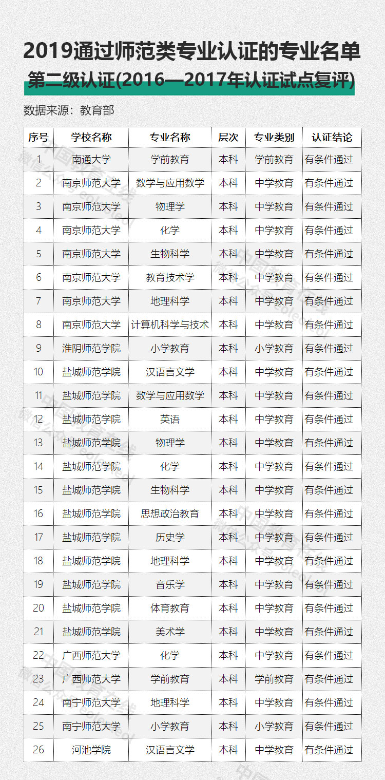 東北師范大學、華中師范大學等17所高校的34個專業(yè)通過第二級專業(yè)認證。(備注:通過第二級認證的專業(yè),在認證結論有效期內入學的師范生,可由高校自行組織中小學教師資格考試面試工作。)