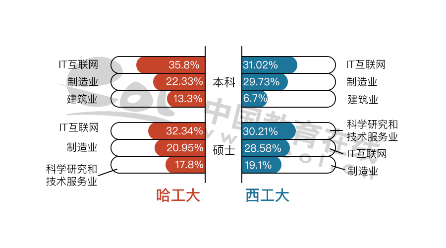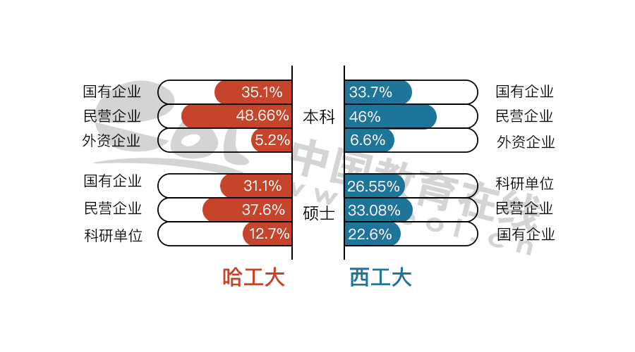 哈工大碩士畢業(yè)生在國有企業(yè)的比例比西工大高。