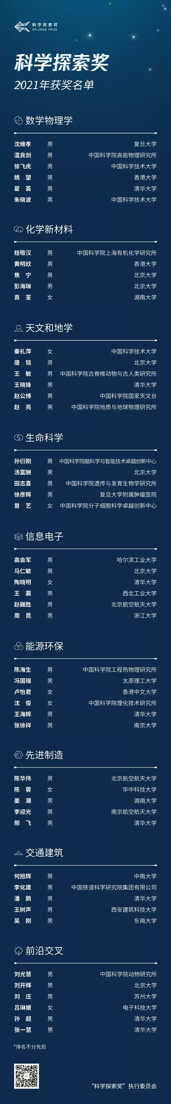 據(jù)悉,“科學(xué)探索獎”于2018年設(shè)立,三年來共評選出150位獲獎人。作為科學(xué)家主導(dǎo)的公益項目,獎項秉持“面向未來、獎勵潛力、鼓勵探索”三大宗旨,鼓勵青年科技人才探索基礎(chǔ)科學(xué)和前沿技術(shù)的“無人區(qū)”,探索社會支持基礎(chǔ)研究人才持續(xù)穩(wěn)定的投入機制。