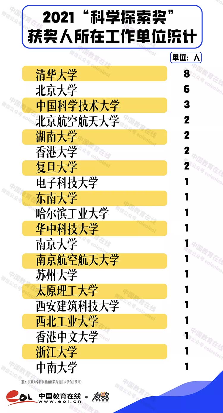 從三年的獲獎名單來看,高校共有116人獲獎,清華大學(xué)、北京大學(xué)的獲獎人數(shù)最多,分別有24位、23位科學(xué)家獲獎,其次,中國科學(xué)技術(shù)大學(xué)有9位科學(xué)家獲此殊榮。