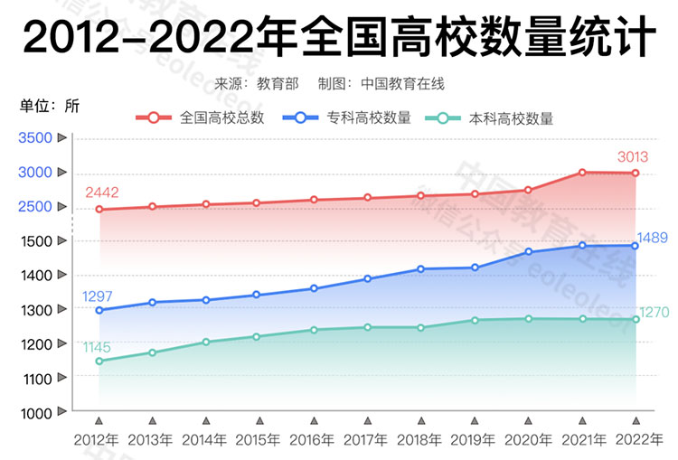 根據(jù)教育部發(fā)布《全國高等學(xué)校名單》,截至2022年5月31日,全國高等學(xué)校共計3013所,相較2012年的2442所,增加了571所,高校數(shù)量逐年平穩(wěn)增長。