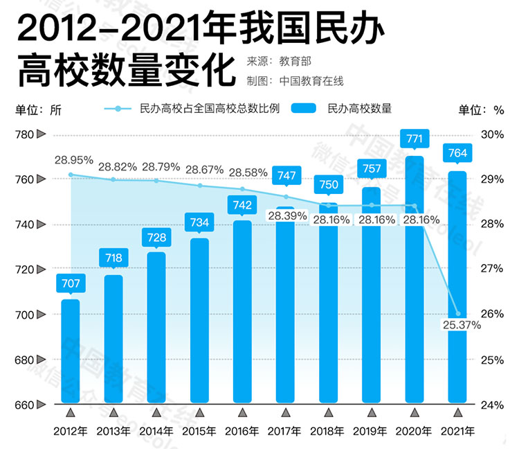 在民辦高校的數(shù)量上,2012年,全國民辦高校共有707所,占全國高??倲?shù)的比例為28.95%。此后,民辦高校數(shù)量平穩(wěn)增長,在2020年達(dá)到771所,是近年來民辦高校數(shù)量的頂峰。2021年,全國民辦高校開始下降,共有764所,占全國高??倲?shù)的比例25.37%。