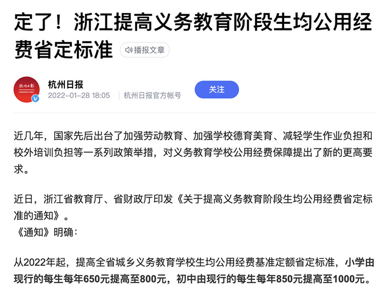 近期,浙江省、青島市等相繼發(fā)布提高義務(wù)教育學(xué)校生均公用經(jīng)費(fèi)標(biāo)準(zhǔn)的通知,浙江從2022年起,小學(xué)由現(xiàn)行的每生每年650元提高至800元,初中由現(xiàn)行的每生每年850元提高至1000元。青島明確從2022年12月起,分別由小學(xué)每生每年900元、初中每生每年1100元,統(tǒng)一提高至小學(xué)每生每年1300元、初中每生每年1700元。