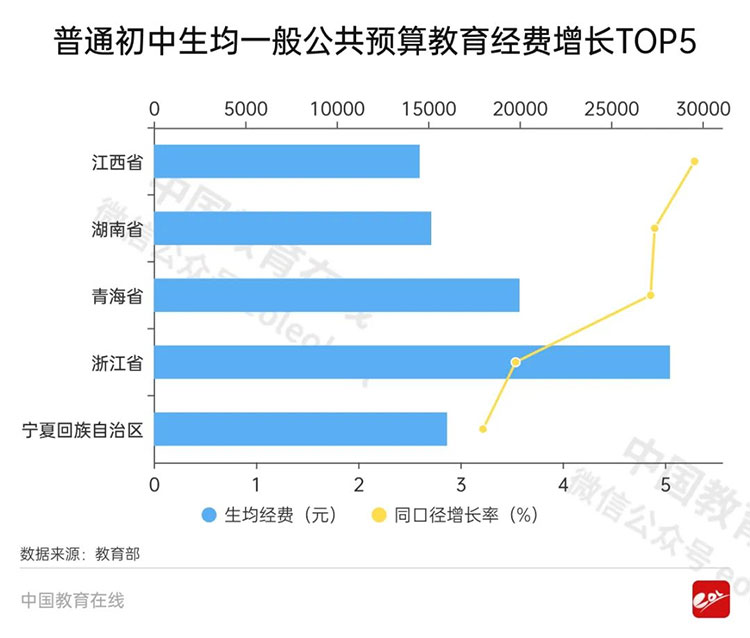 全國普通初中為17772.06元,同口徑比上年增長1.74%。各省區(qū)市中,增長最快的是江西省(5.29%)。其次為湖南省(4.9%)、青海省(4.86%)、浙江省(3.54%)、寧夏回族自治區(qū)(3.22%)。